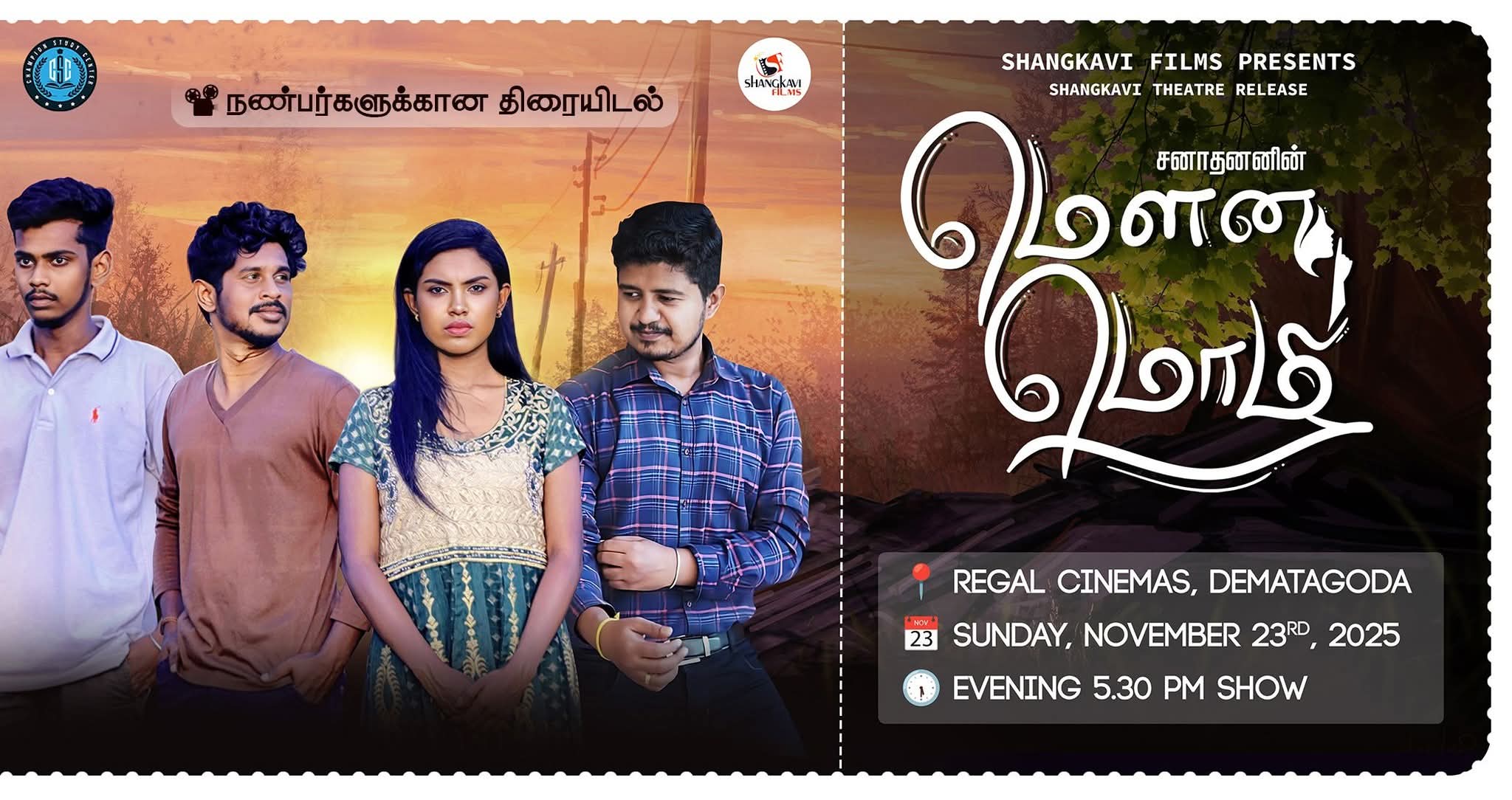 சனாதனனின் இயக்கத்தில் சங்கவி பிலிம்ஸ் வெளியீட்டில் வினோத்ரோன் ஒளிப்பதிவில் தனுஹரியின் படத்தொகுப்பில் மதீசனின் இசையில் தமிழ் FM, ஆதவன் FM தினகரன் வாரமஞ்சரி ஊடக அனுசரனையில் வரும் 23ம் திகதி கொழும்பு தெமட்டகொட றீகல் திரையரங்கில் முதல் காட்சி திரையப்படவிருக்கிறது..