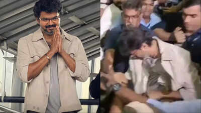 ஏர்போர்ட்டில் இருந்து வெளியில் வரும்போது கூட்ட நெரிசலில் சிக்கி கொண்டார் விஜய். அவர் காரில் ஏற சென்ற போது தவறி கீழே விழுந்தார். இந்த சம்பவம் கடும் அதிர்ச்சியை ஏற்படுத்தி இருக்கிறது.